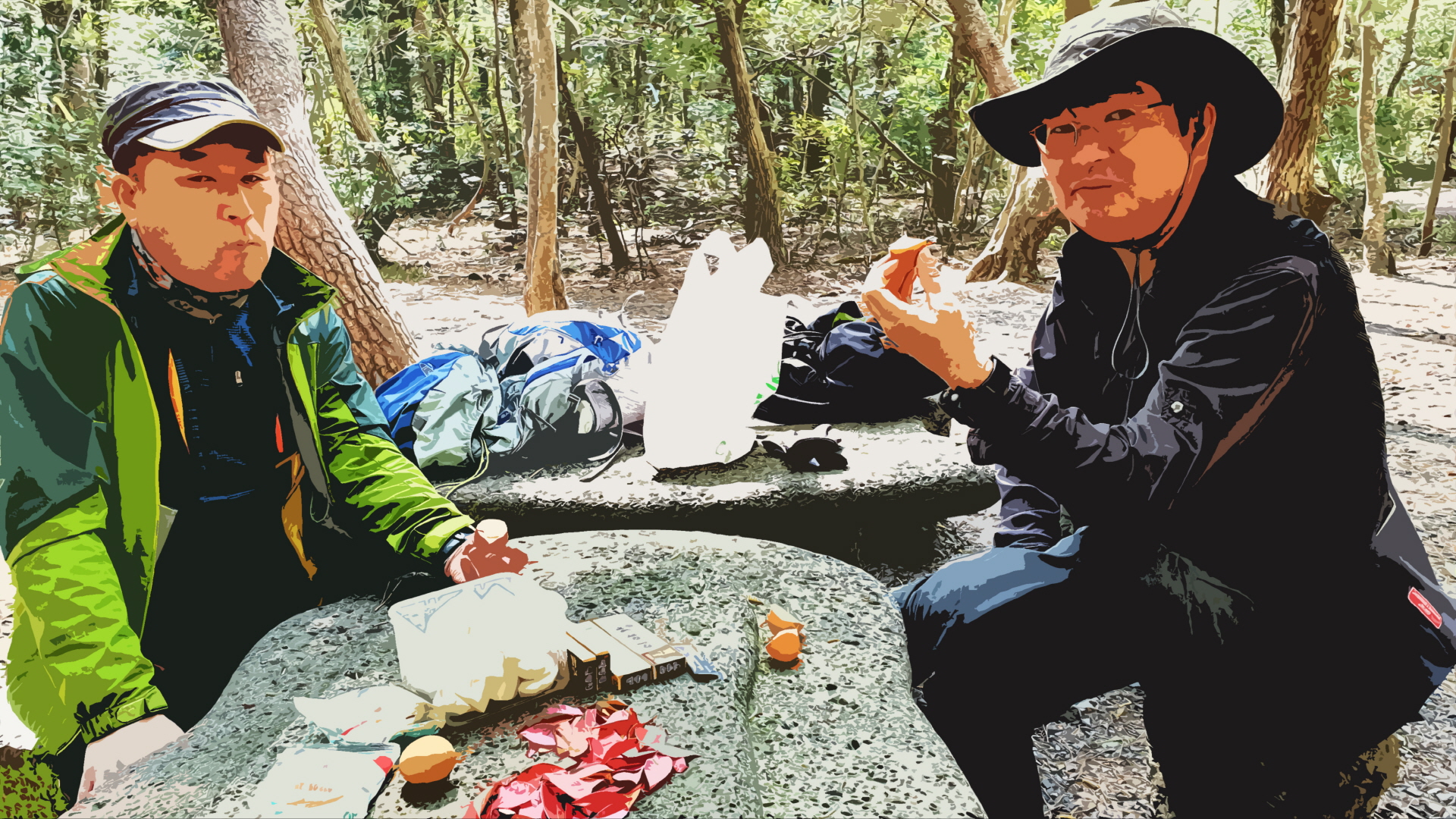 약간의 허탈감을 뒤로하고 계속 트레킹, 반환점인 약초재배사에 도착하니 작년에는 새끼였던 리트리버 가족들이 반겨줌을 넘어 산행을 마칠 때까지 계속 따라옵니다.