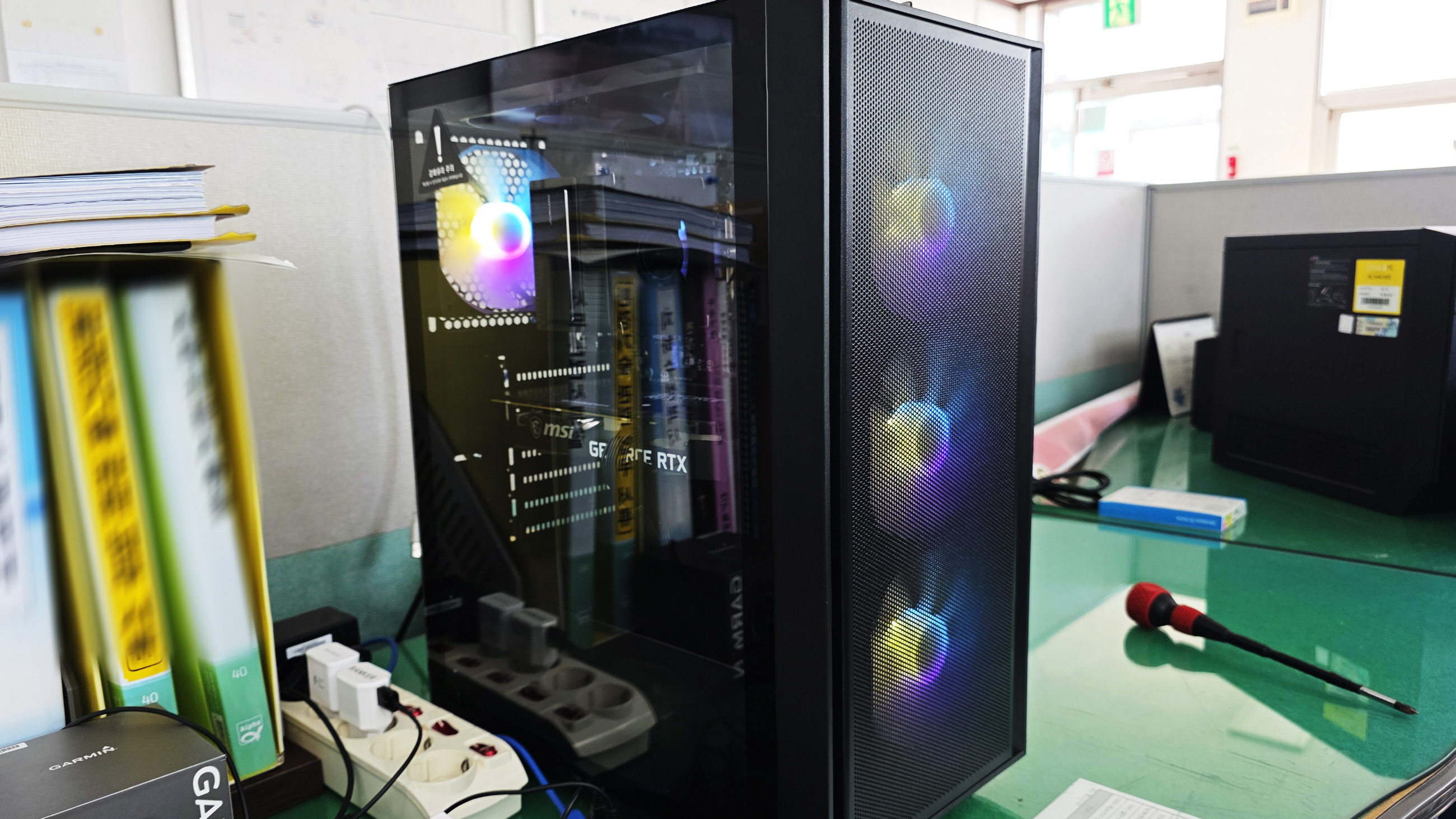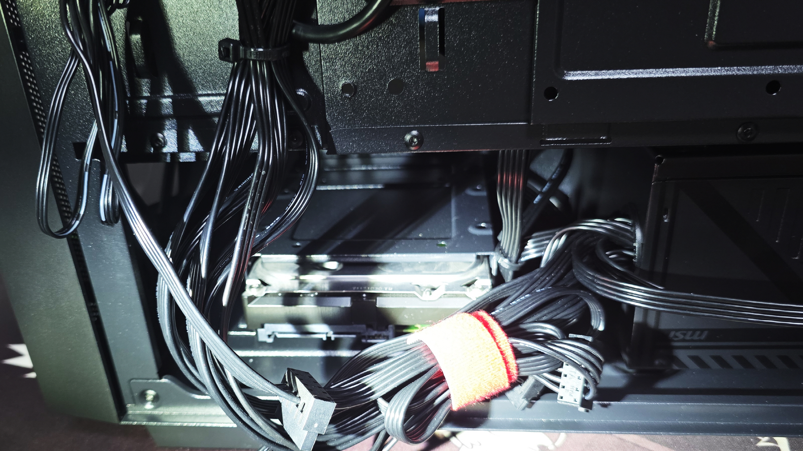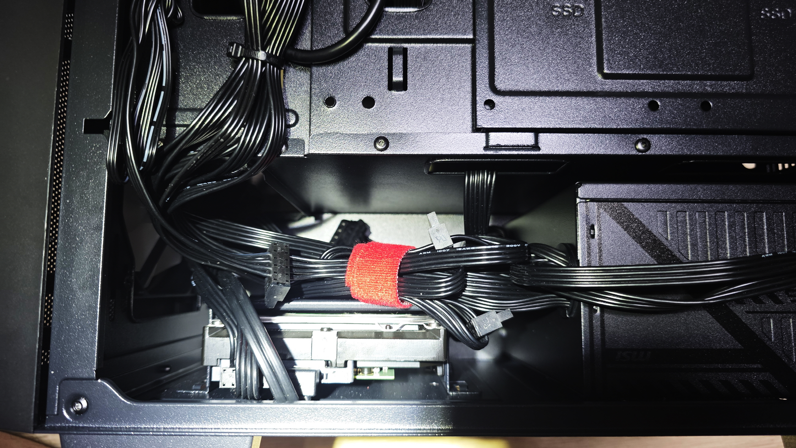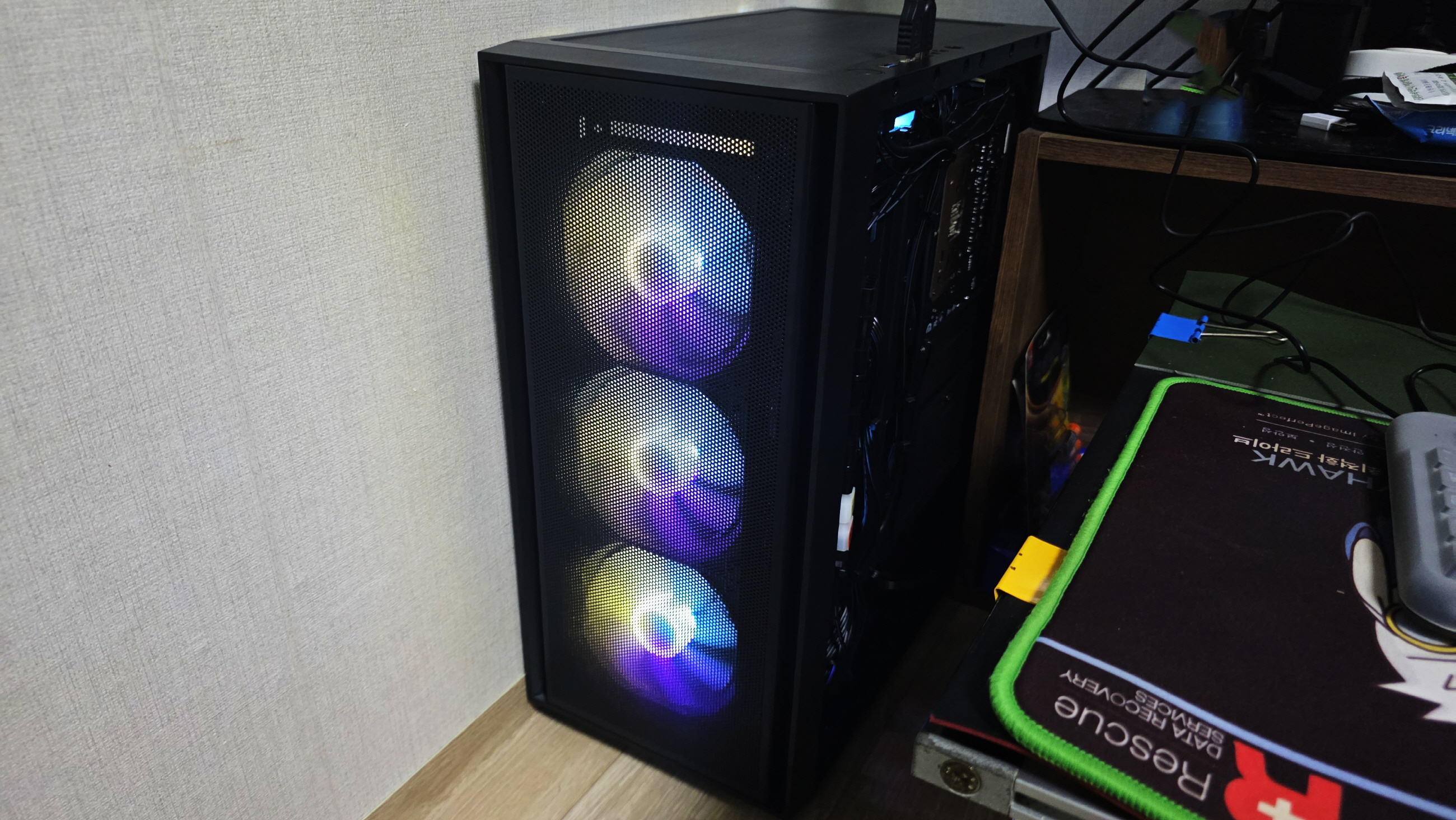 마지막으로 그전 컴퓨터에서 쓰던 데이터 백업용 HDD 설치, 오랜만이어서 그런지 부품들이 새로워져서 그런지 HDD SATA 케이블을 어떻게 꽂아야 될지 몰라 헤매다 메인보드를 눈이 빠져라 쳐다보다 그래픽카드에 가려져 있던 SATA포트 발견, 그래픽카드 분리 후 SATA 케이블 연결 HDD도 설치 마무리하고 케이블 정리 후 본 격적으로 사용합니다.